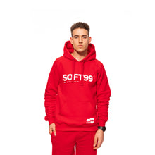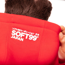 Red hoodie with white Soft99 logos, referring to the colors of the Soft99 brand. Made of high quality 280 g combed cotton. White Soft99 logo and Japanese signs for "Soft99 Corporation" on the chest. Soft99 logo on the left side of the pocket and Soft99 Japan logo on the right shoulder.